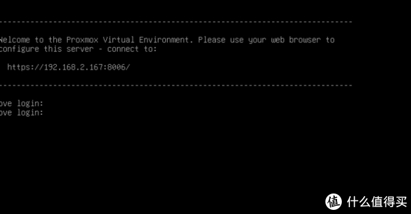 1、重启完成之后出现如下页面,表示安装成功,记录下屏幕中出现的ip地址,接下来的配置无需使用PVE主机显示,单个显示器的朋友可以将显示器切换到主机了。