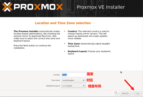 5、设置国家、时区、键盘布局,然后点击Next(下一步)。