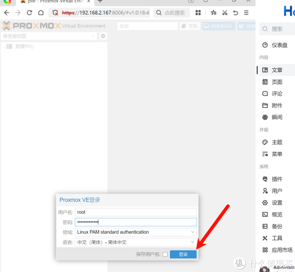 2、在浏览器输入https://192.168.2.167:8006进入PVE配置页面,用户名为root,密码为在安装过程中设置的,语言为了方便设置为简体中文,然后点击登录。