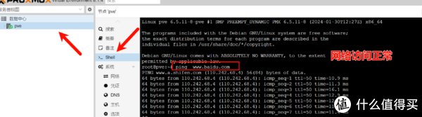 5、使用pve自带的shell工具来ping百度,测试网络是否正常,出现正确的ping值表示外网访问通畅。