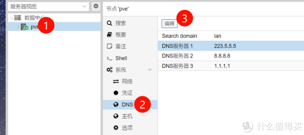 4、首先我们需要配置一下pve的dns来保证pve可以正确访问到网络,这里我使用了阿里云公共的DNS,223.5.5.5,223.6.6.6,然后点击ok。