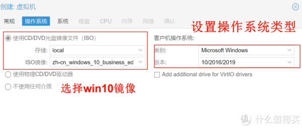3、操作系统中选择windows10镜像,然后在类型中选择安装操作系统的类型,注意版本也要选择。