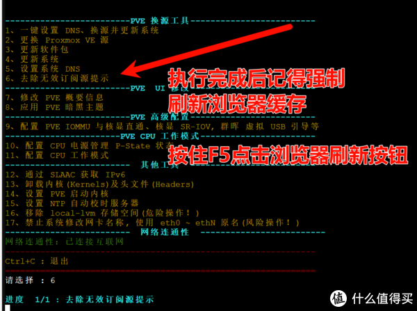 每次在登录pve的时候会弹出企业订阅提示,对于普通用户我们直接去除掉弹窗即可,登录PVE,在Shell窗口中输入./pve_source,进入pve工具箱,输入6,系统会自动执行去除订阅脚本,脚本运行完成后请强制刷新浏览器缓存。