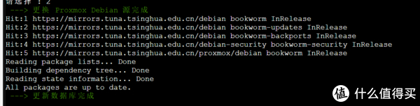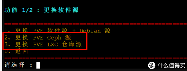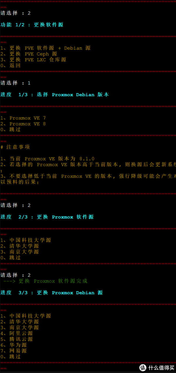 3、为了更方便了解脚本都干了什么,建议分步执行23456,输入数字2,然后再输入1更换 PVE 软件源 + Debian 源,分别输入列表前面的数字选择PVE版本和软件源镜像站(不清楚的直接都选择清华大学源就行)。