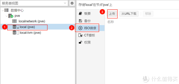 1、首先需要上传安装镜像,通过local(pve)→ISO镜像→上传,将win10镜像上传到pve中。