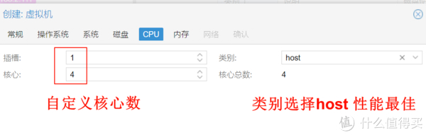 6、CPU根据机器配置选择,插槽表示cpu个数单CPU机器输入1,核心根据CPU选择,类别使用HOST系统性能最大化。