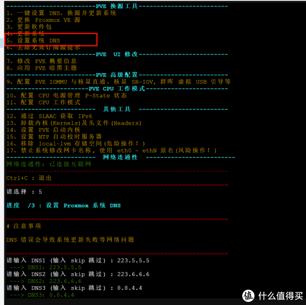 2、登录PVE,在Shell窗口中输入./pve_source,进入pve工具箱,按7进入pve概要信息定制向导,根据自身喜好选择合适的版本,这里我使用推荐方案1:高大全版本。