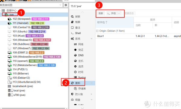 1、点击pve节点→更新→刷新→升级,既可以完成最新软件包和组件的升级。